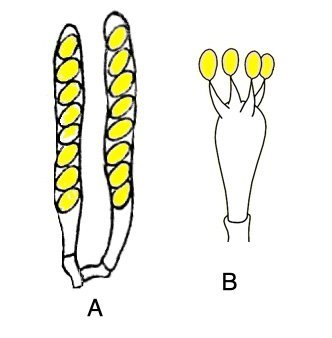 On distingue principalement parmi les Champignons, les Ascomycètes dont les spores (en jaune sur le schéma ci-contre) sont rangées dans des sacs nommés asques (A) et les Basidiomycètes où elles sont tenues sur des pédoncules à l’extérieur d’organes appelés basides (B). On trouvera en outre quelques autres Champignons et affines. Les Myxomycètes ne sont pas des Champignons mais des « Protozoaires ». Les Lichens sont par ailleurs classés parmi les Champignons bien que formés d’une alliance symbiotique stabilisée entre un Champignon et une Algue ou une Bactérie chlorophyllienne.