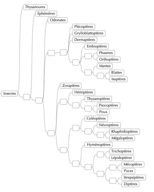 | ➢ Neoptera Martynov, 1923 [Infra-Classe] | ➢ Blattodea Latreille, 1910 ➢ Coleoptera Linnaeus, 1758 ➢ Dermaptera de Geer, 1773 ➢ Diptera Linnaeus, 1758 ➢ Hemiptera Linnaeus, 1758 ➢ Hymenoptera Linnaeus, 1758 ➢ Lepidoptera Linnaeus, 1758 ➢ Mantodea Burmeister, 1839 ➢ Mecoptera Hyatt & Arms, 1891 ➢ Neuroptera Linnaeus, 1758 ➢ Orthoptera Linnaeus, 1758 ➢ Phasmatodea Leach in Brewster, 1815 ➢ Psocoptera Shipley, 1904 ➢ Siphonaptera Latreille, 1825 ➢ Trichoptera Kirby, 1813 |