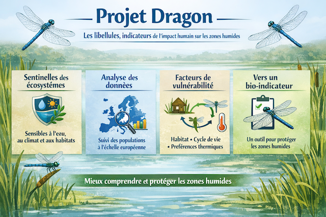 Le projet Dragon explore l’utilisation des libellules comme indicateurs de l’impact humain sur les zones humides, encore peu suivies par rapport à d’autres milieux. Ces insectes sont de bonnes sentinelles car ils vivent à la fois dans l’eau et dans l’air et réagissent vite aux changements environnementaux. Leur sensibilité à la qualité de l’eau, au climat et aux habitats permet d’évaluer l’état des écosystèmes.
