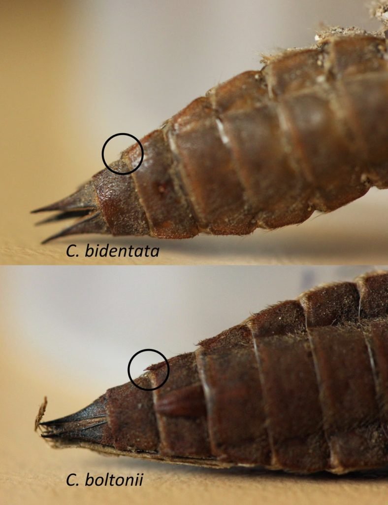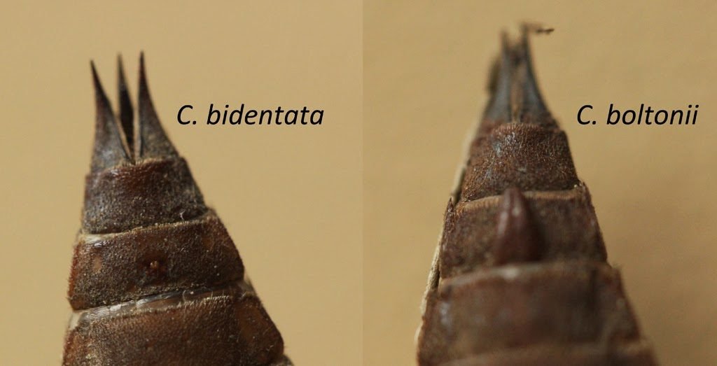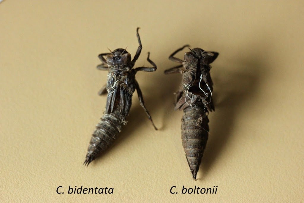 Les Cordulegaster bidentata se mêlent ici aux Cordulegaster boltonii. La distinction entre les exuvies des deux espèces réside principalement dans la présence d’épines latérales sur les segments S9 et S8 pour Cordulegaster boltonii, et leur absence pour bidentata.