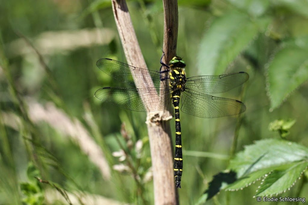 C’est sur ce même ruisseau, près d’un pont en bordure de clairière qu’un individu a émergé, laissant derrière lui son exuvie. La larve est ainsi remontée le long d’un muret en pierre, plus d’1,50 m au-dessus de l’eau, afin de s’agripper à quelques frêles tiges de graminées !