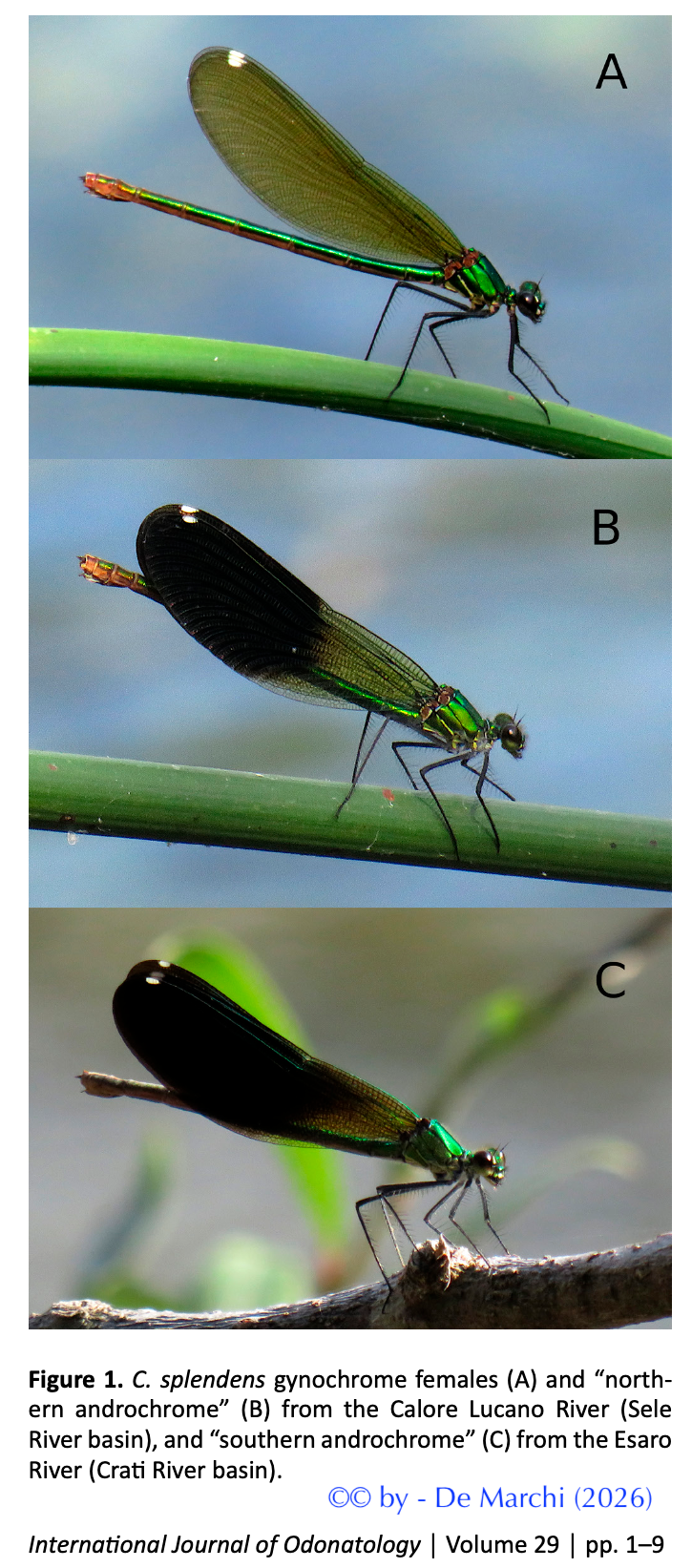 De Marchi G. 2026 – Intraspecific rather than interspecific drivers of female-limited polymorphism in Calopteryx splendens (Odonata: Calopterygidae). – Intern. J. of Odonatol., 29, 7 janvier 2026 : 1-9.