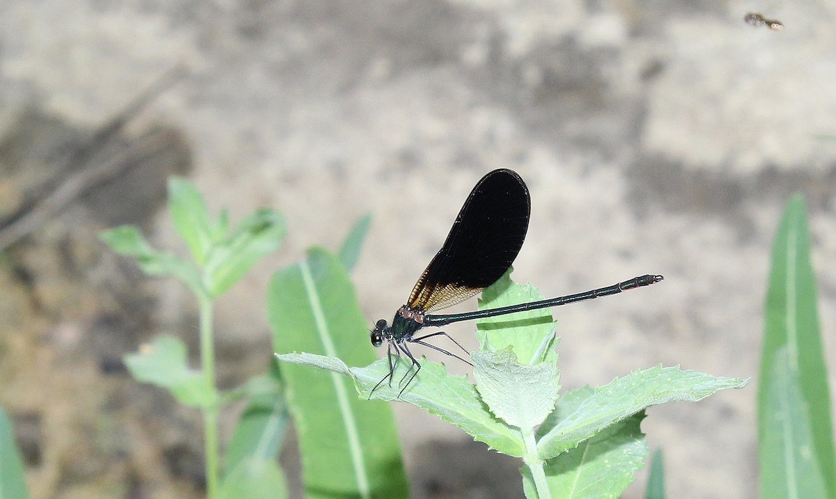 « Tous » les mâles (N=49) de la zone considérée sont très similaires. Leur abdomen foncé tend vers le noir sans aucun « semblant » de rouge perceptible et ce quel que soit l’état de maturité des individus. J’ai repéré néanmoins quatre individus où ce patern diffère : trois au noir atténué et un présentant des teintes rougeâtres. Pour tous les spécimens le motif de coloration de la marque alaire a la même forme avec une zone éclaircie bien dessinée à la base, plus étendue au bord inférieur de l’aile. La coloration sombre (noire) de l’abdomen est compatible avec Calopteryx haemorrhoidalis f. nurag Deliry, [2008] tels que je les ai rencontrés en Sardaigne et en Corse. Pour ces deux îles, les femelles avait souvent un apex sombre, parfois un bandeau alaire.