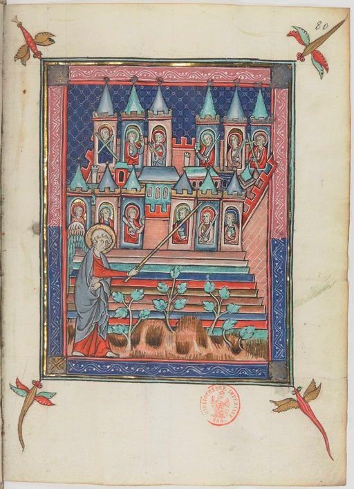 Quatre Libellules portent le cadre de l’image de cet ange tenant une baguette avec en fond les 12 apôtres