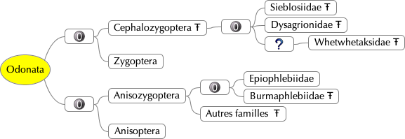 Deux tendances récentes se retrouvent chez les auteurs. Il s’agit tout d’abord de la suppression du sous-ordre des Epiproctes, sur des arguments qui me semblent pour l’heure insuffisants : je conserve donc ce sous-ordre. Ensuite il semble y avoir une incompréhension au niveau des Anisozygoptères (Ŧ ?)1 qui ont longtemps été maintenus en parallèle des Zygoptères et des Anisoptères. Outre des fossiles on y place la famille actuelle des Epiophlébiidés. Je considère avec d’autres auteurs que les Anisozygoptères ne sont formés que par des fossiles. Ils forment un infra-ordre sous les Epiproctes, voisin de celui des Epiophlébioptères. Ces derniers sont constitués de la famille fossile des Burmaphlebiidés Ŧ et des actuels Epiophlebiidés. Par ailleurs j’inclus comme un sous-ordre, les Tarsophlébioptères Ŧ au sein des Odonates.