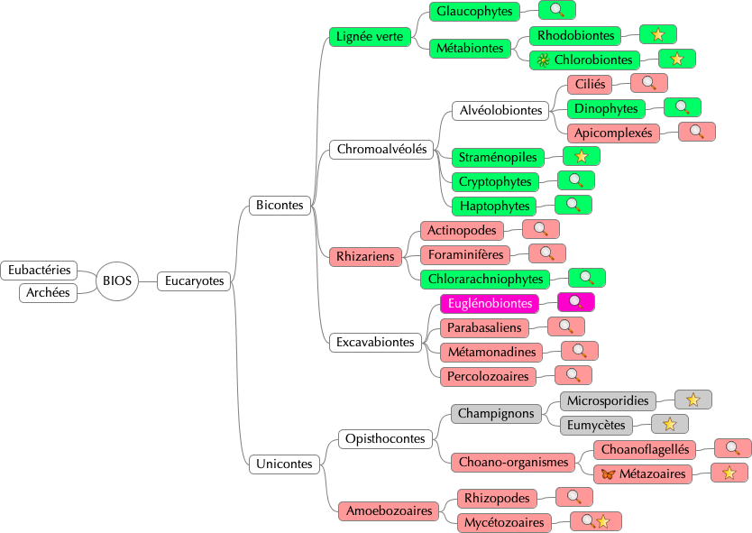 Il s’agit d’un groupe majeur d’êtres vivants caractérisés par leurs cellules possédant fondamentalement un ou plusieurs noyaux (contenant l’ADN principal), voire plus aucun. Les noyaux baignent dans Cytoplasme clôt par des membranes plasmiques. Ce sont les Bicontes, de teinte végétale et les Unicontes, de teinte animale.