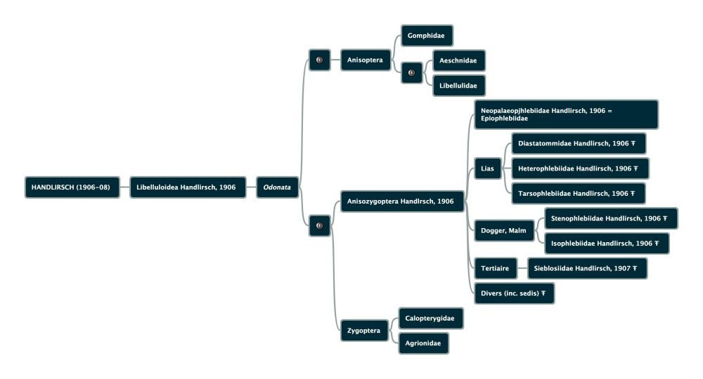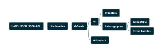 | 🔍 - Grands ensembles chez Odonates selon Handlirsch (op. cit.)[28] – Cette structure fondamentalement triparte restera en vigueur jusqu’en 2022[29], alors même qu’elle avait été déboutée par Nel & al. en 1993[30] |