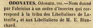 Il a été d'abord assez peu utilisé, mais de Selys Longchamps (1840) le place comme synonyme des Libellulidées (les Odonates forment selon cet auteur un sous-ordre rangé dans l'Ordre des Névroptères) et de Selys Longchamps & Hagen (1850) titrent leurs ouvrage de ce nom mais sans en utiliser clairement la dimension systématique. Cette dimension sera prise tardivement et par exemple le Dictionnaire universel d'Histoire Naturelle dirigé par Charles d'Orbigny (tome 8 : 1847), en fait un terme tout à fait secondaire (fig. ci-contre). Ce n’est donc que bien plus tard que l’Ordre des Odonates prendra sa pleine dimension.