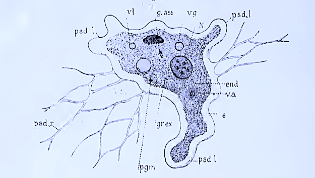 L’Amibe est présentée comme exemple type pratique dans la page sur les « Protozoaires » et les Rhizopodes sont détaillés et illustrés dans le paragraphe sur les Sarcodines, qui rappelons-le forment un ensemble artificiel réparti désormais chez les biflagellés (« Bicontes ») au sein des Rhizariens et les Unicontes au sein des Rhizopodes tels que présentés ici.
