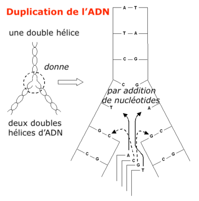 La réplication de l’ADN se traduit par une duplication de toutes les molécules d’ADN de la cellule au cours de la Phase S du cycle cellulaire. A partir d’une molécule d’ADN on obtient deux molécules identiques.