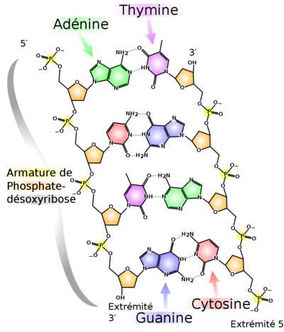 Hydrogen = Hydrogène – Oxygen = Oxygène – Nitrogen = Azote – Carbon = Carbone – Phosphorus = Phosphore – Minor groove = Petit sillon – Major groove = Grand sillon – A = Adénine – T = Thymine – C = Cytosine – G = Guanine