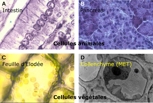 A gauche : en haut : cellule animale, en bas cellule végétale