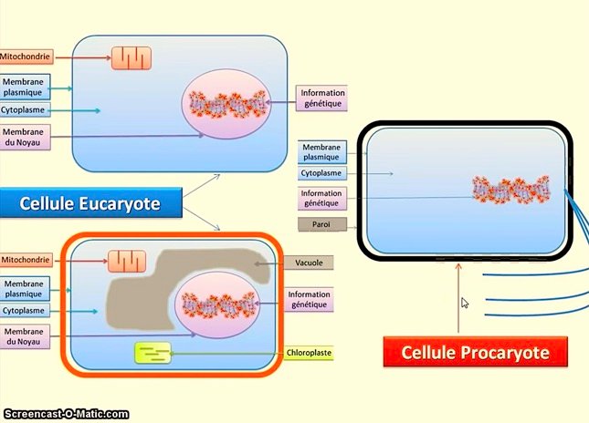 On trouve deux grands types de cellules : les cellules sans noyau, ni autre organite qui forment les Procaryotes et des cellules avec des organites, notamment un noyau qui forment les Eucaryotes.