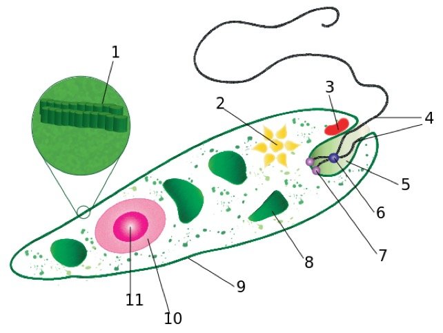 L’Euglène est une sorte de mélange entre animal (se déplace et se nourrit) et végétal (réalise la photosynthèse). Les cellules végétales classiques ne se déplacent pas et présentent, de plus, une paroi cellulaire supplémentaire (voir schéma en haut de page ou photo ci-dessous). Certains Euglènes mutants qui ne produit pas de chlorophylle et n’a pas de chloroplaste. Sa structure est proche de celle des cellules animales. Les cellules animales n’ont pas de chloroplastes et ne possèdent pas de paroi.