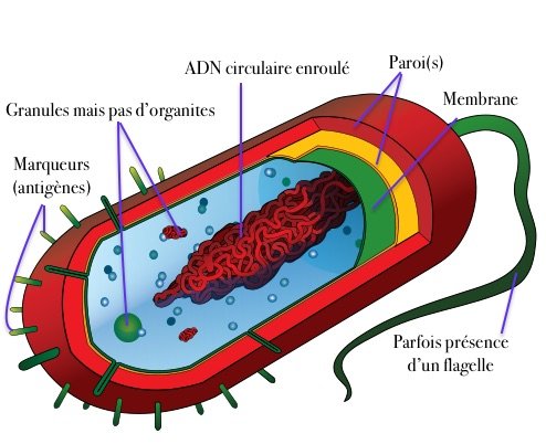 Chez les Procaryotes, aux trois éléments constitutifs fondamentaux (membrane, cytoplasme, ADN) s’ajoute une paroi dite « bactérienne ». Certaines d’entre-elles possèdent en outre des flagelles ou des cils (pilli), permettant leur déplacement actif. Ce sont des cellules de petite taille (0,1 µm à quelques µm). Ce sont toujours des unicellulaires, parfois coloniaux : les Bactéries et les Archées sont des Procaryotes.