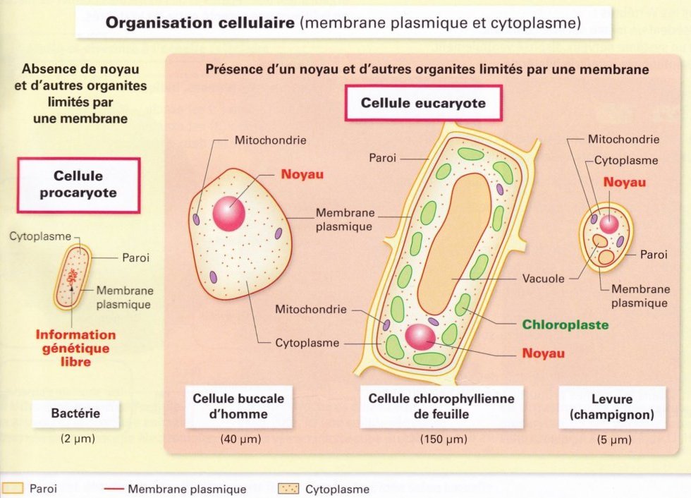 Chez les organismes unicellulaires, toutes les fonctions sont assurées par une seule cellule. Les cellules bactériennes (procaryotes) n’ont pas de noyau (ADN directement dans le cytoplasme), alors que les cellules animales ou végétales en possèdent un (eucaryotes2)… et parfois plusieurs. Dans le cas des Eucaryotes l’ADN se trouve dans le noyau, décondensé3 sous forme de chromatine. Les procaryotes et les cellules végétales présentent une ou plusieurs parois autour de la membrane cytoplasmique.