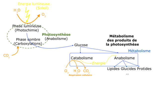 La photosynthèse est une réaction chimique célèbre de l’anabolisme : CO2 + H2O donne grace à de l’énergie lumineuse et avec l’aide de la chlorophylle et d’enzymes du glucose + 02. Cette réaction chimique est réalisée par les Plantes vertes et libère de l’oxygène dans notre atmosphère.
