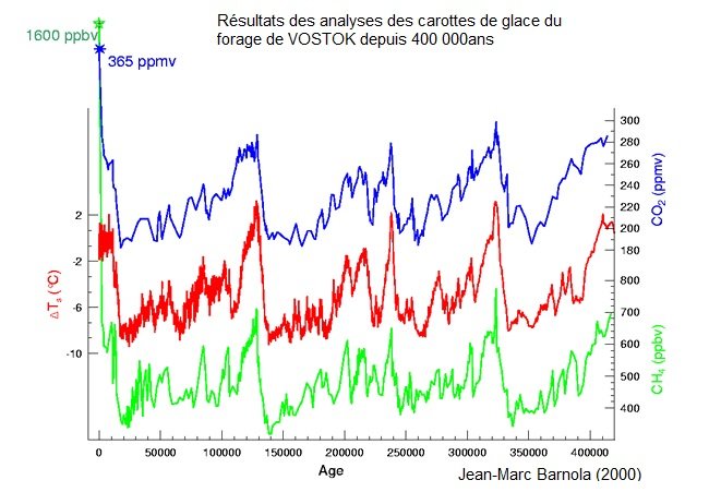 Le forage de Vostok en Antarctique, commencé en 1998, a permis de prélever de la glace vieille de 420 000 ans, à plus de 2600 mètres de profondeur. Grâce à ces glaces, les scientifiques ont montré qu’il y a un lien direct entre la quantité de gaz à effet de serre dans l’air (comme le CO₂ et le méthane) et la température à la surface de la Terre. Le graphique montre que pendant les 400 000 dernières années, quand la concentration de ces gaz augmente, la température augmente aussi. Depuis 1960, on remarque que la quantité de CO₂ a fortement augmenté à cause des activités humaines.
