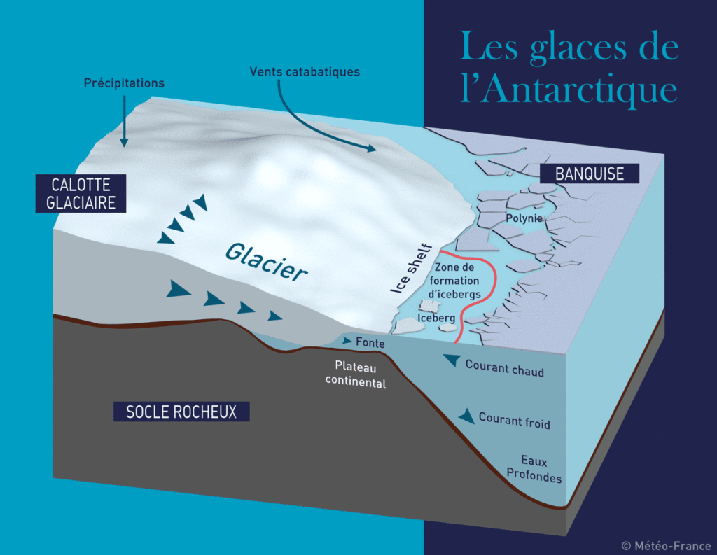 La calotte glaciaire de l’Antarctique est une grande masse de glace alimentée par les précipitations de neige. Cette glace s’écoule lentement vers la mer, formant des glaciers et des plateformes de glace flottantes appelées « ice shelf ». Sous l’effet des vents froids et des courants océaniques, certains morceaux de glace se détachent pour former des icebergs. L’eau chaude qui remonte sous la plateforme fait fondre la glace, contribuant à la montée du niveau des océans. Cette interaction entre glace, océan et atmosphère est importante pour comprendre le climat de la Terre.
